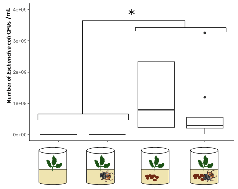 In the summer of 2024, undergraduate student saran Jayaselvam developed a research project to better understand how E.coli shed by wildlife (white-tailed deer) might impact the safety of leafy greens. Foodborne illness outbreaks are a significant public health challenge, and an important source of outbreaks is wildlife feces. Using a laboratory study, we investigated the potential of a common dung beetle (Onthophagus nuchicornis) to mitigate E. coli transfer from white-tailed deer (Odocoileus virginianus) feces to kale plants. We found that when mesocosms contained deer feces, splash-mediated contamination resulted in E. coli transfer to kale. Although dung beetles buried large volumes amounts of deer feces, their presence did not substantially lower E. coli levels on kale leaves.