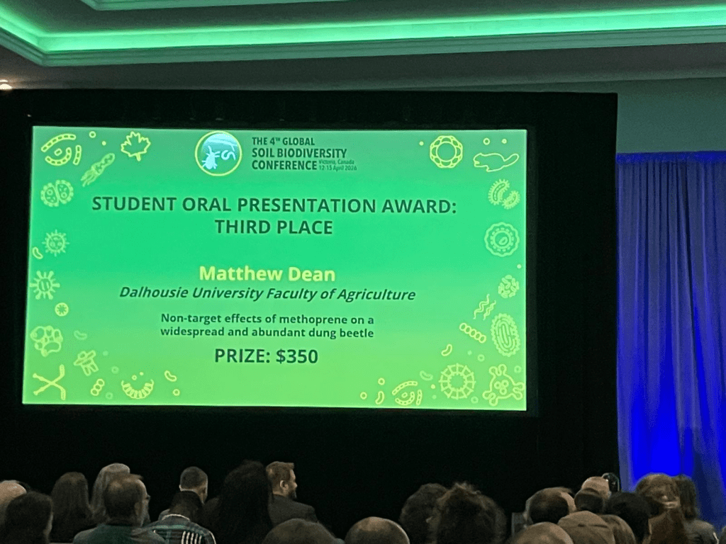 Last week MSc student Matthew Dean (co-supervised by the wonderful Erin Cameron at SMU) spent a few days in Victoria BC as part of the Global Soil Biodiversity Conference. Matt gave his very first oral presentation at a scientific conference to a very international audience. If you know Matt, you know he has a way of making his ideas clear & engaging. Clearly the judging panel felt the same way, and Matt came home with an award as the 3rd place for oral presentations!